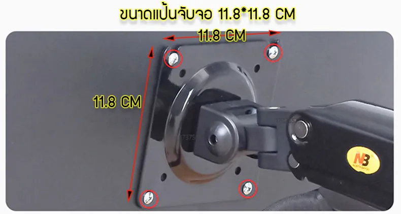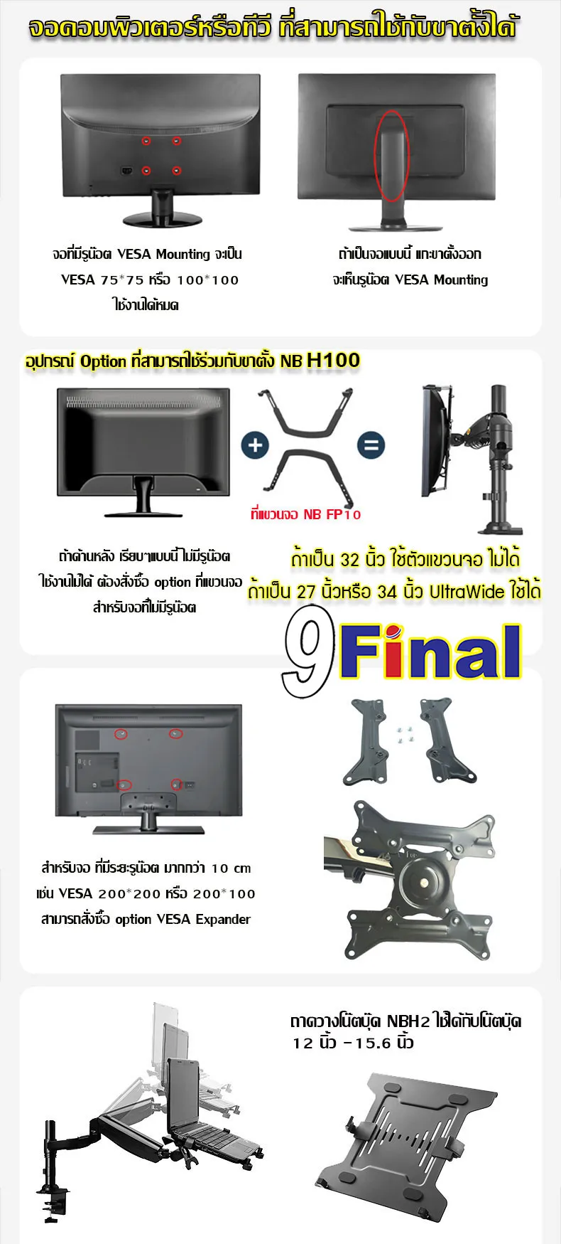 - ใช้ได้กับจอ มาตราฐาน VESA compliant 75*75, 100*100 ( ในกรณีที่จอ ไม่มีรูน๊อต VESA Mount สามารถสั่งซื้อ Option อุ้มจอ NB FP1)
