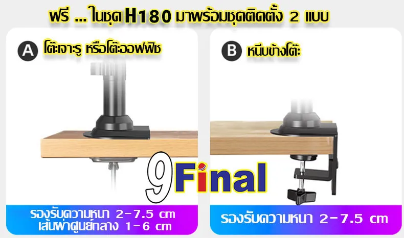 - ติดตั้งง่ายกับขอบโต๊ะหรือบนโต๊ะก็ได้ มาพร้อมชุดติดตั้ง 2 แบบ ฟรี