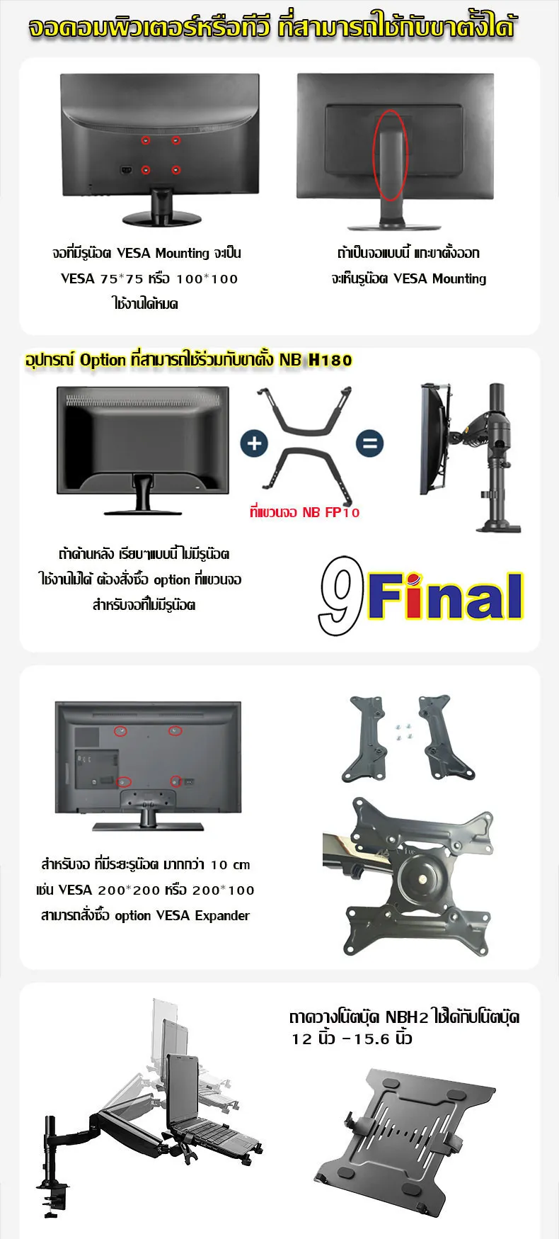 - ใช้ได้กับจอ มาตราฐาน VESA compliant 75*75, 100*100 ( ในกรณีที่จอ ไม่มีรูน๊อต VESA Mount สามารถสั่งซื้อ Option อุ้มจอ NB FP1)
