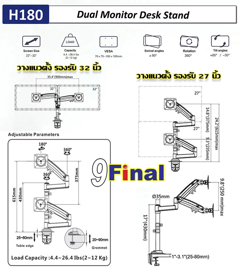 - รองรับหน้าจอ 22- 32 นิ้ว *2 ตัว